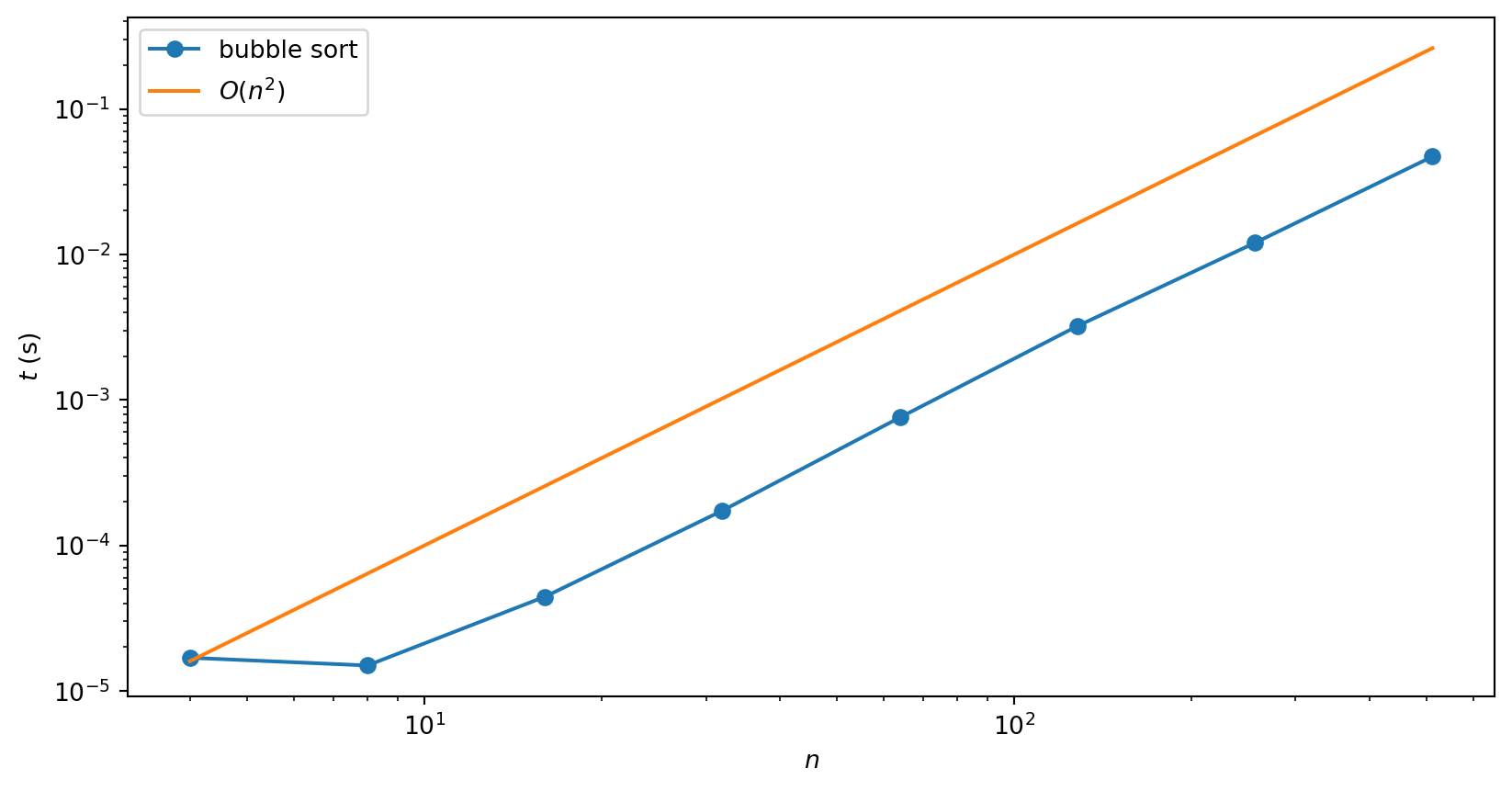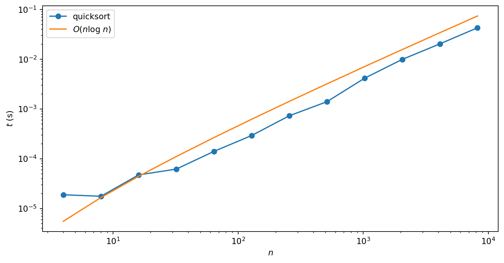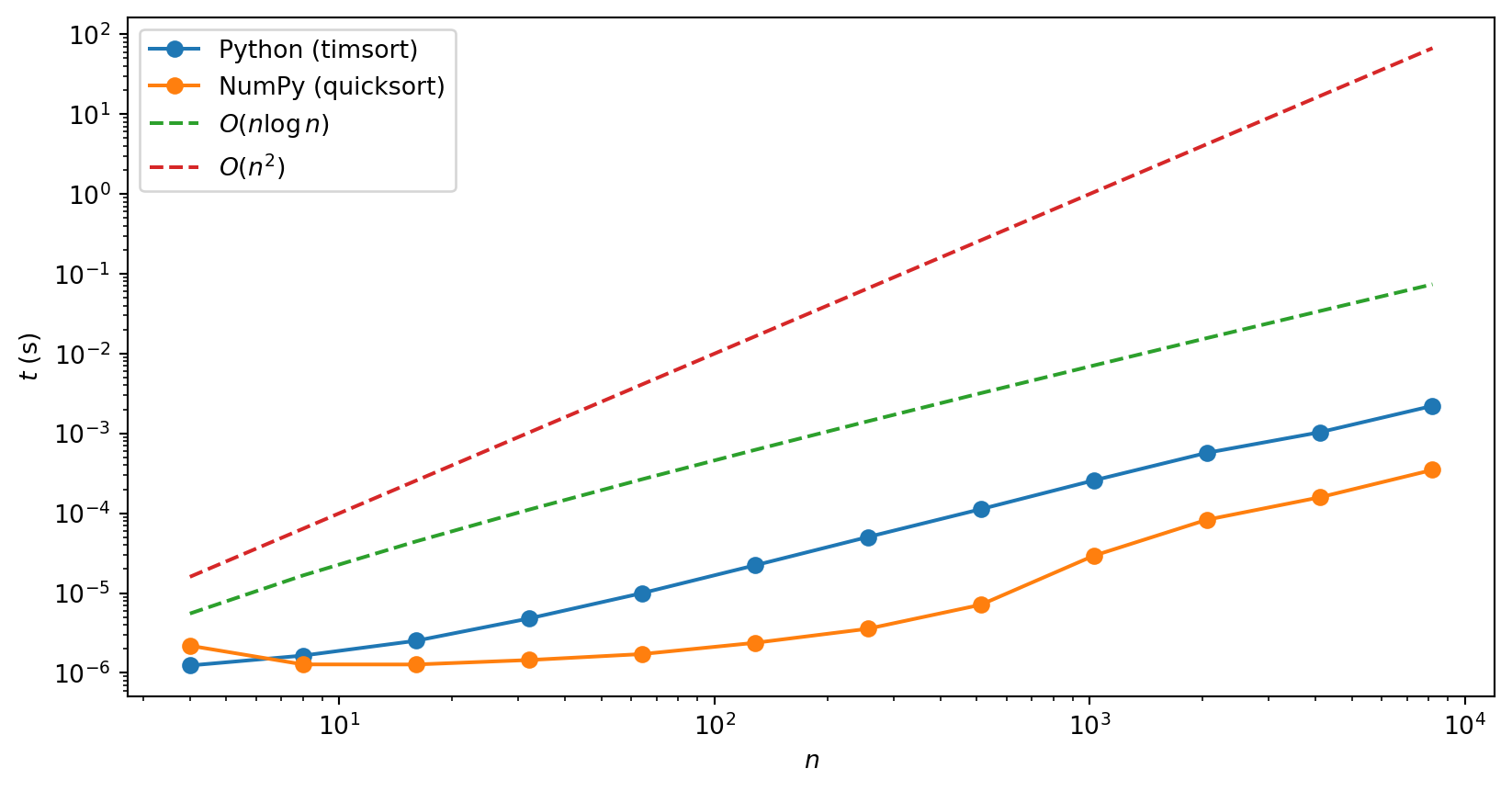 NumPy’s sort uses quicksort, whereas Python’s sorted uses a hybrid algorithm called Timsort, which also has \(O(n\log n)\) average case performance